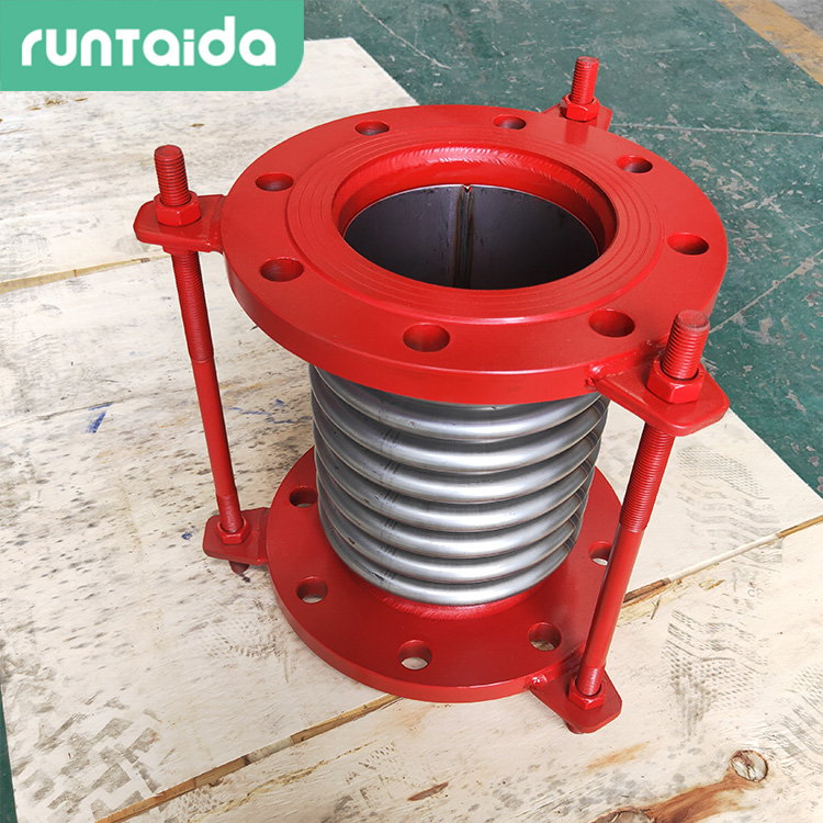 由法塵、接管、波紋管焊接而成的金屬波紋膨脹節補償器裝置,它內部建有內襯管,內襯管中段空白處還建有由導流筒、導流筒環板、套筒、套筒環板構成的伸縮圈、導流筒、套筒等是抗氧化的耐熱鋼材料,它們重疊部分有五到二十毫米的間隙,并且用耐高溫絕熱材料填充在內襯管外側空腔和伸縮圈內腔里面,而內襯管內側則用耐高溫的耐火泥澆注而成,所以這款膨脹節作用很好。